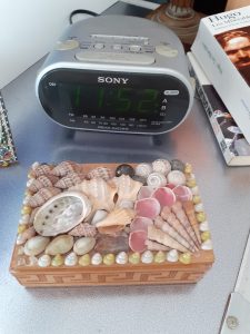 Hoy al despertar, todavía dentro de una habitación oscura, he hecho un cálculo mental cuando he mirado el reloj en diagonal, como haciendo una posición de yoga imposible de alcanzar. He bajado la tapa de una de mis cajas más apreciadas, decorada con caracolas y conchas de mar, que me sirve las veces de “cortina” para esconder la hora verde del reloj digital. Con su justa medida me procura un descanso de luces de pantalla a las que desgraciadamente ya estoy demasiado habituada. He mirado el reloj….9h50