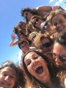 La Helena va patir més, en sortir va caure dos cops i alguna bestia empipada li va fer una mossegada. Res seriós però. Quan vam arribar, algunes ja feien l’aperitiu d’altres dormien al sol.. Al poc recollíem i anàvem a dinar al xiringo al costat del port. Una gran taula allargada de cara a les petites dunes rodejades de també petits arbres.